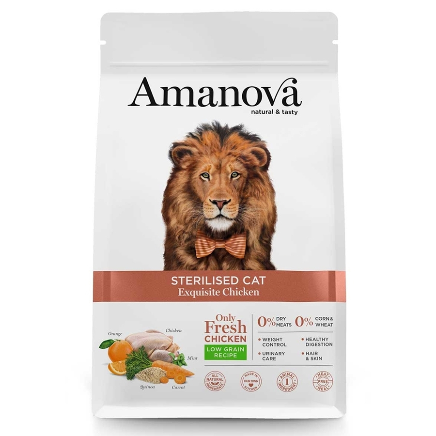 Η Amanova Sterilized Chicken είναι τροφή για στειρωμένες γάτες από την ηλικία των 12 μηνών. Παρασκευάζεται μόνο με φρέσκο κοτόπουλο ως τη μόνη ζωική πηγή, περιέχει υψηλό επίπεδο πρωτεΐνης, ιδανικό για την ανάπτυξη και συντήρηση της μυϊκής μάζας της γάτας.