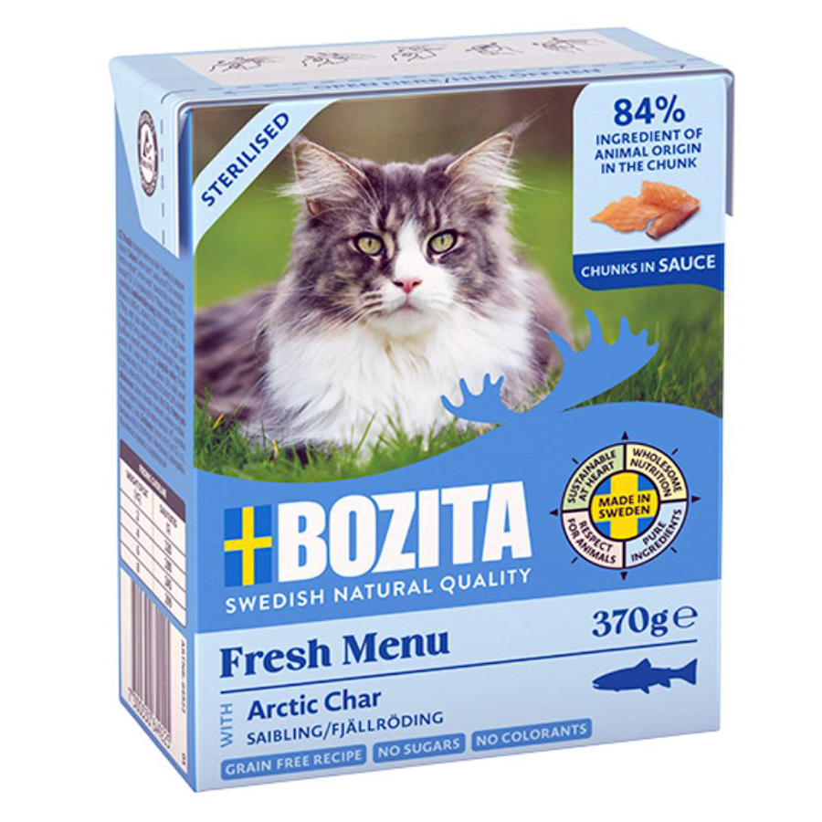 To Bozita Chunks Sterilised Arctic Char In Sauce Grain Free για στειρωμένες γάτες με Artic Char είναι μια νόστιμη πλήρης υγρή τροφή προσαρμοσμένη στις στειρωμένες γάτες. Παρασκευάζεται με υλικά υψηλής ποιότητας και 84% συστατικά ζωικής προέλευσης.