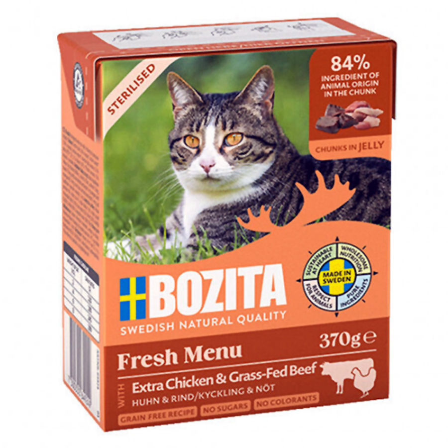 Το Bozita Sterilized chicken and beef in jelly είναι μια ισορροπημένη πλήρης τροφή για ενήλικες γάτες