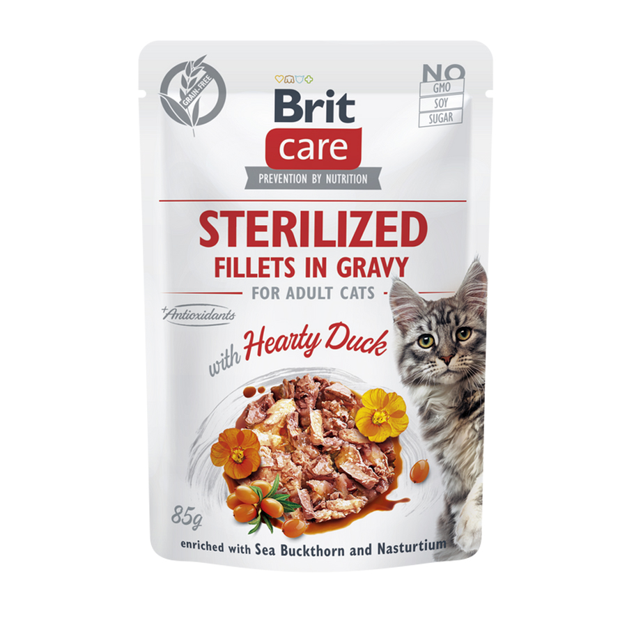 Η Brit Care Cat Fillets In Gravy Sterilized Duck είναι μια super premium, χωρίς δημητριακά, υγρή τροφή για ενήλικες στειρωμένες γάτες, η οποία περιέχει 85% φιλέτο πάπιας σε ζωμό κρέατος, ιδανικό για την κάλυψη των διατροφικών αναγκών της γάτας σας. Εμπλουτισμένη με ιπποφαές και νεροκάρδαμο, προσφέρει φυσική υποστήριξη για το ανοσοποιητικό και το ουροποιητικό σύστημα, ενώ βοηθά στην πρόληψη των προβλημάτων με τα νεφρά και τα ουροποιητικά.