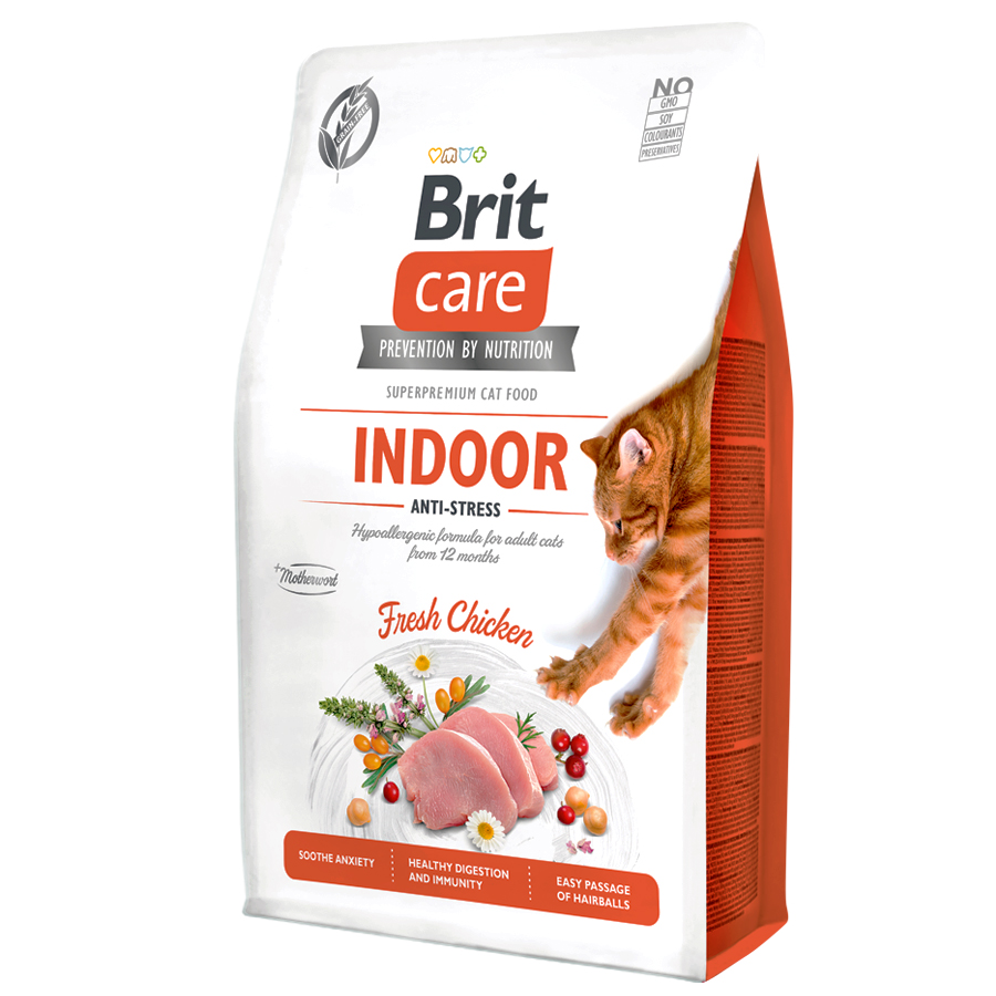 Υποαλλεργική σύνθεση για ενήλικες γάτες άνω των 12 μηνών. Η κολοκύθα η οποία είναι πλούσια σε ίνες, τα αποξηραμένα μήλα, ο φλοιός και οι σπόροι ψύλλιου συμβάλλουν στην εύκολη διέλευση των τριχοβεζωαρίων. Οι ακατέργαστες ίνες δημιουργούν την αίσθηση της πληρότητας, η οποία οδηγεί στη βέλτιστη ποσότητα κατανάλωσης της τροφής με αποτέλεσμα τη διατήρηση του σωματικού βάρους στα επιθυμητά επίπεδα. Ο συνδυασμός φρέσκου κρέατος και γεύματος κρέατος υψηλής ποιότητας καθιστά τη γεύση και το άρωμα της Brit Care Cat ελκυστική ακόμη και για τις πιο απαιτητικές γάτες. Όλα τα προϊόντα παράγονται χρησιμοποιώντας φυσικά συστατικά και δεν περιέχουν πρόσθετη γλουτένη, ζάχαρη, σόγια, τεχνητές γεύσεις ή συντηρητικά. Το Mojave yucca βοηθά στη μείωση της οσμής των κοπράνων. Τα προβιοτικά και τα πρεβιοτικά προάγουν την ανάπτυξη των ωφέλιμων βακτηρίων στο έντερο και ρυθμίζουν τις μεταβολικές διεργασίες. Η πρωτεΐνη κρέατος υψηλής ποιότητας παρέχει υγιή πέψη και απαραίτητη ενέργεια για έναν ενεργό τρόπο ζωής. Οι γάτες που ζουν εντός σπιτιού εκτίθενται συχνά σε στρεσογόνες καταστάσεις, που μπορούν να προκληθούν από οποιαδήποτε αλλαγή στην ζωή τους, όπως ένα νέο μέλος του νοικοκυριού, ανακαινίσεις επίπλων, μετακίνηση, ταξίδια του Σαββατοκύριακου, κλπ. Όλα αυτά έχουν αρνητικό αντίκτυπο στο νευρικό και κυκλοφοριακό σύστημα των αιλουροειδών. Η δρόγη είναι γνωστή για την ικανότητά της να παρέχει στις γάτες φυσική και αποτελεσματική προστασία από το στρες. Σταθεροποιεί την καρδιακή λειτουργία και μειώνει την υψηλή αρτηριακή πίεση, που βοηθά τις γάτες να αντιμετωπίσουν το άγχος της ζωής εντός του σπιτιού.