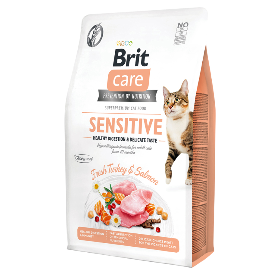 Υποαλλεργική σύνθεση για ενήλικες γάτες άνω των 12 μηνών. Ο συνδυασμός φρέσκιας γαλοπούλας και σολομός υψηλής ποιότητας καθιστά τη γεύση και το άρωμα της Brit Care Cat ελκυστική ακόμη και για τις πιο απαιτητικές γάτες. Δεν περιέχουν πρόσθετη γλουτένη, ζάχαρη, σόγια, τεχνητά αρώματα ή συντηρητικά. Η Mojave yucca βοηθάει στη μείωση των οσμών των κοπράνων. Τα φρούτα, τα βότανα και τα μούρα είναι πλούσια σε βιταμίνες και φλαβονοειδή και διασφαλίζουν μια εντυπωσιακή εμφάνιση και μια υγιή ζωή. Ο βέλτιστος συνδυασμός βιταμινών και οργανικών ιχνοστοιχείων υποστηρίζει την καθημερινή δραστηριότητα και ευεξία. Υψηλής πεπτικότητας σύνθεση χωρίς δημητριακά, πλούσια σε απαραίτητα θρεπτικά συστατικά τα οποία διασφαλίζουν την πλήρη και εύκολη απορρόφηση τους. Τα προβιοτικά και τα πρεβιοτικά συμβάλλουν στην υγιή ανάπτυξη των ωφέλιμων βακτηρίων του εντέρου και ρυθμίζουν την διαδικασία του μεταβολισμού. Το ιπποφαές συμβάλλει στην υγεία των νεφρών και του ουροποιητικού συστήματος. Η χαμηλή περιεκτικότητα σε μαγνήσιο και L-μεθειονίνη βοηθούν στην διατήρηση των βέλτιστων τιμών του pH των ούρων από 6.0 έως 6.5.