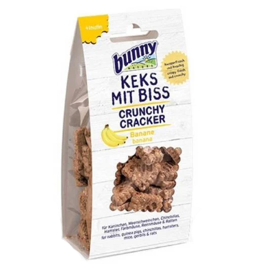 Τα BUNNY NATURE CRUNCHY CRACKER είναι φρέσκα, λαχταριστά τραγανά μπισκότα για όλα τα τρωκτικά, τα οποία περιέχουν πολύτιμη ινουλίνη. Η ινουλίνη είναι ένας φυσικός πολυσακχαρίτης που παράγεται από πολλά είδη φυτών. Είναι επίσης ένα πρεβιοτικό με ιδιαίτερη αξία διότι συμβάλλει στη ρύθμιση του επιπέδου σακχάρου στο αίμα, ενώ παράλληλα σταθεροποιεί την εντερική χλωρίδα στα τρωκτικά. Μια ξεχωριστή λιχουδιά βασισμένη στην εκλεπτυσμένη γεύση μπανάνας σε συνδυασμό με το τραγανό crunchy cracker!