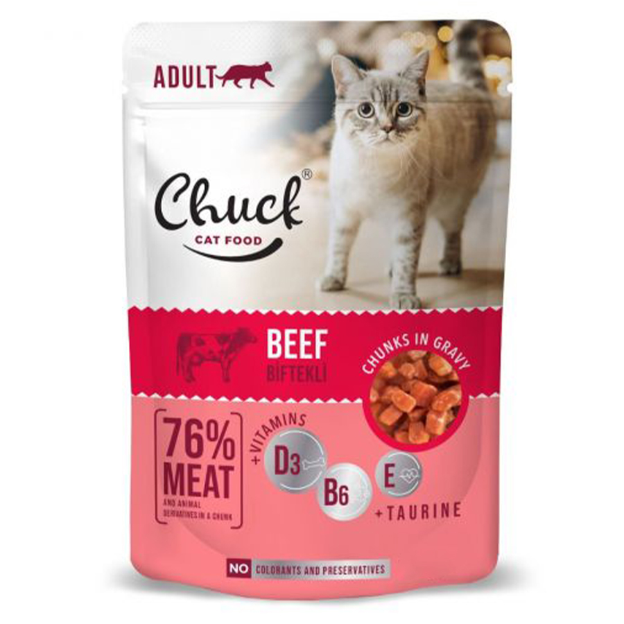 Πλήρης τροφή για γάτες με μοσχάρι σε ντελικάτη σάλτσα, για ενήλικες γάτες όλων των φυλών.