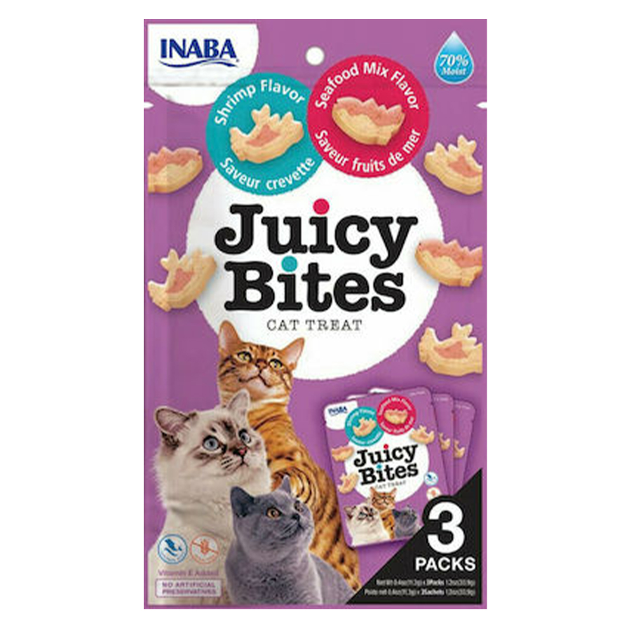 CHURU CAT JUICY BITES SHRIMP & SEAFOOD είναι υγρές λιχουδιές τόνου και κοτόπουλου σε μέγεθος μπουκιάς με φυσικές γεύσεις, εκχύλισμα πράσινου τσαγιού και βιταμίνη Ε. Χωρίς κόκκους , συντηρητικά ή τεχνητά χρώματα.