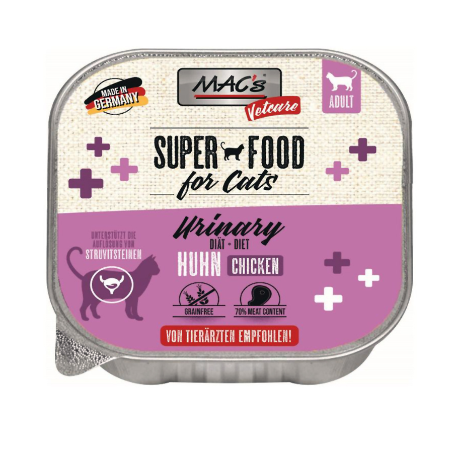Η πλήρης διαιτητική τροφή για ενήλικες γάτες Urinary Cat Κοτόπουλο της MAC’s βοηθά στη διάλυση των λίθων στρουβίτη. Με τα MAC’s η γάτα σας παίρνει αυτό που της αρέσει περισσότερο – το κρέας. Αποφεύγοντας σταθερά τα τεχνητά συστατικά και εστιάζοντας σε μια φυσική διατροφή, όπως η απαραίτητη ανάγκη για ταυρίνη, τα MAC’s διασφαλίζουν ότι η γάτα σας έχει μια υγιεινή και ισορροπημένη διατροφή.