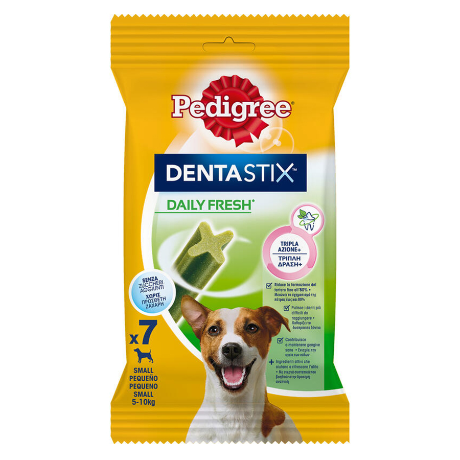 To Pedigree Dentastix Fresh έχει την ίδια δράση του Pedigree Dentastix και επιπλέον περιέχει έλαιο ευκάλυπτου και εκχύλισμα από πράσινο τσάι, που όχι μόνο καλύπτει τη δυσοσμία αλλά καταπολεμά και την αιτία της. Έτσι, φροντίζετε καθημερινά τα δόντια του σκύλου σας, και ταυτόχρονα καταπολεμάτε τη δυσάρεστη αναπνοή. Μπορείτε να του το προσφέρετε οποιαδήποτε στιγμή της ημέρας και ταιριάζει μοναδικά με την καθημερινή του διατροφή.