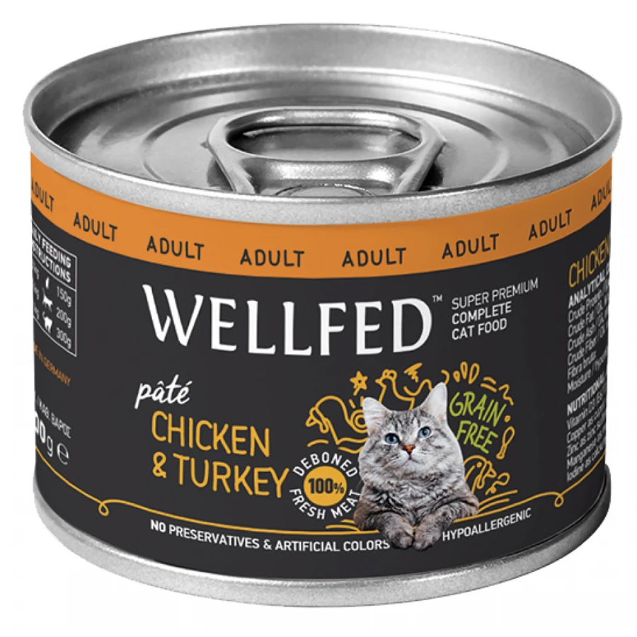 Περιέχει 70% κρέας, καρδιές και συκωτάκια (50% κοτόπουλο 20% γαλοπούλα), ζωμός 28.8%, μεταλλικά στοιχεία 1%, λάδι σολομού 0.2%.