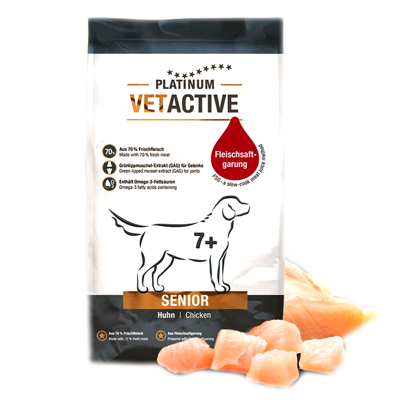 Όσο μεγαλώνει ένα ζώο, τόσο πιο δύσκολο είναι για το σώμα να διατηρήσει τις φυσιολογικές διεργασίες. Αυτό επηρεάζει ολόκληρο τον μεταβολισμό καθώς και την πέψη, την οικοδόμηση των μυών και την καύση λίπους. Ως εκ τούτου, ιδιαίτερα τα ηλικιωμένα ζώα χρειάζονται επαρκείς πρωτεΐνες υψηλής ποιότητας που δεν επιβαρύνουν τον οργανισμό αλλά εξουδετερώνουν τη διαδικασία γήρανσης. Το 70% φρέσκο κρέας παρέχει στους ηλικιωμένους σας την υψηλότερη ποιότητα πρωτεΐνης. Οι πολύτιμες πρωτεϊνικές αλυσίδες και τα αμινοξέα δεν καταστρέφονται από την ειδική διαδικασία αργού μαγειρέματος PLATINUM VET ACTIVE και έχουν υψηλή βιολογική αξία, η οποία είναι ιδιαίτερα σημαντική για τους ηλικιωμένους σκύλους.