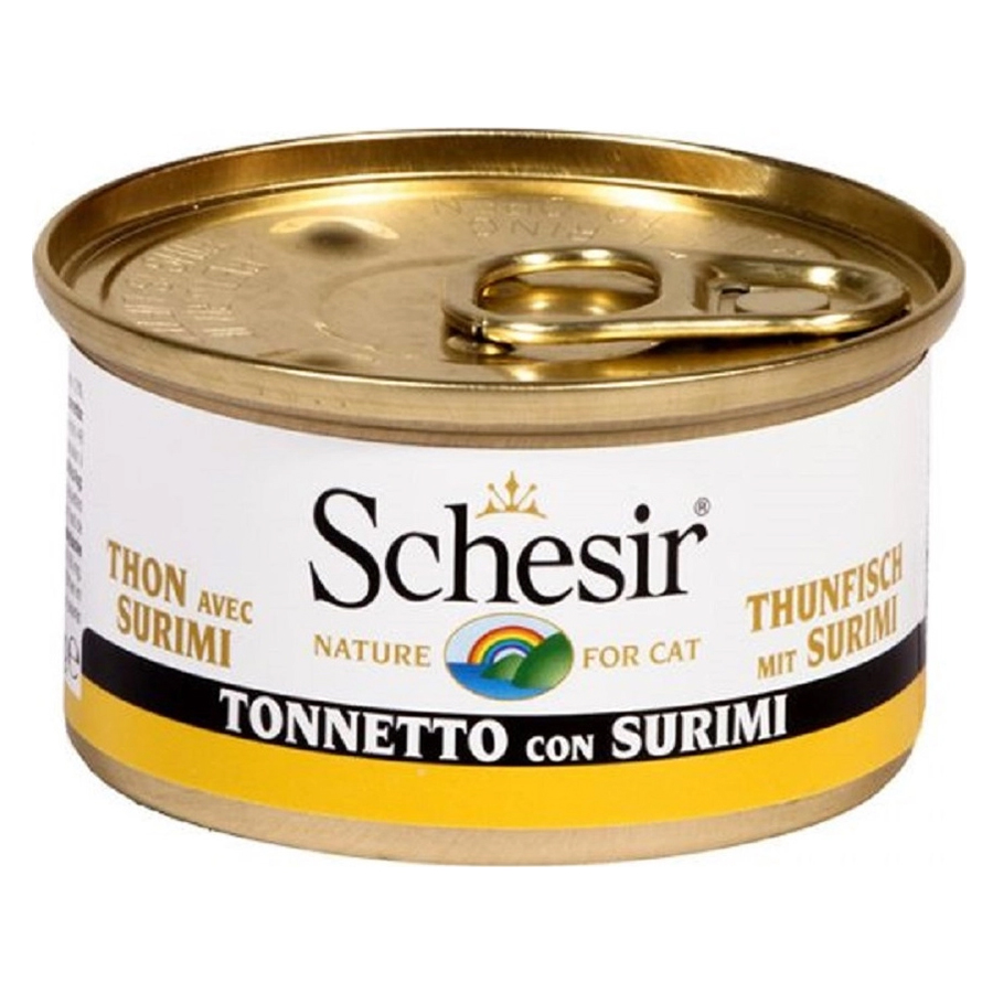 Συμπληρωματική υγρή τροφή γάτας Schesir Jelly με τόνο και σουρίμι.Το σουρίμι είναι ένα μίγμα από αλεσμένα ψάρια με Ιαπωνική συνταγή.