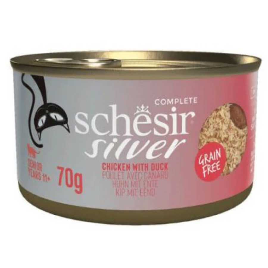 Η μους & φιλέτο Schesir Silver με κοτόπουλο και πάπια είναι μια τροφή ειδικά σχεδιασμένη για γάτες ηλικίας 11 ετών και άνω.
