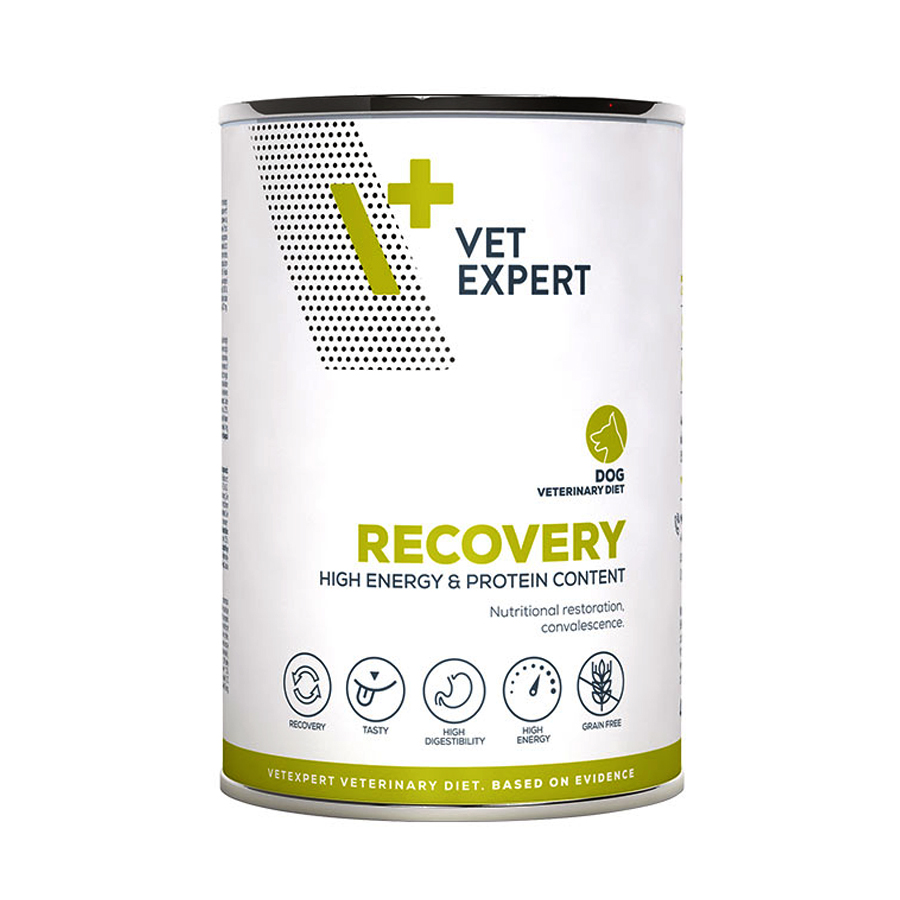 H Veterinary Expert Recovery Dog είναι μια πλήρης υγρή τροφή για σκύλους σε ανάνηψη και επαναφορά στη φυσιολογική διατροφή. Περιέχει κρέας και παράγωγα για αυξημένη γευστικότητα και απορρόφηση πρωτεϊνών. Έχει υψηλά επίπεδα ενέργεια για να πληροί τις ενεργειακές απαιτήσεις των ζώων σε ανάνηψη. Επιπλέον έχει χαμηλά επίπεδα ινών για βελτιωμένη πεπτικότητα και υψηλά πρωτεϊνικά επίπεδα ώστε να διευκολύνει την απορρόφηση θρεπτικών συστατικών σε σκυλάκια με προβληματική πέψη και απορρόφηση.
