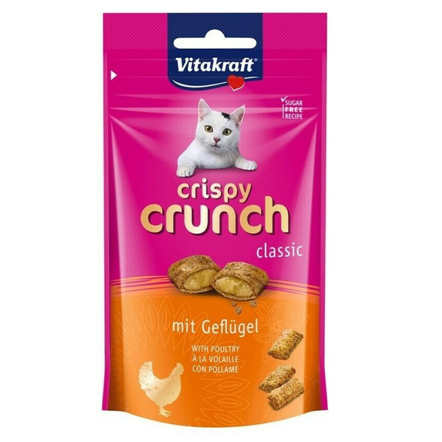 Νέα τραγανά snack με απίστευτα πλούσια γεύση και μια ισορροπημένη ποικιλία που δεν αφήνει ανεκπλήρωτη καμία επιθυμία της γάτας σας.Τραγανές μπουκίτσες δημητριακών, γεμιστές με κρέμα και νόστιμο κοτόπουλο.Συνταγή χωρίς ζάχαρη.Η Vitakraft λειτουργεί σύμφωνα με την φράση ”τροφή όπως στην φύση” και το κάθε προϊόν έχει συστατικά όπως σπόρους, φρούτα, σιτηρά, βιταμίνες και ιχνοστοιχεία για να καλύψουν τις ανάγκες των ζώων.Η εταιρία προσφέρει τροφές, λιχουδιές και παρασκευάσματα για πολλά είδη κατοικίδιων.Η υψηλή ποιότητα και αποτελεσματικότητα των προϊόντων Vitakraft είναι αναγνωρισμένη από τους πελάτες.